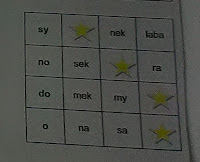 Przygotowałam kartoniki, na których są tabelki. Zielona sylaba rozpoczynająca wyraz będzie widoczna, pozostałe zakryte farbą do zdrapek, jak na zdjęciu wyżej. W każdym rzędzie są sylaby, które tworzą wyraz z tą pierwszą sylabą i okienko z gwiazdką. Jeśli dziecko trafi na sylabę – czyta wyraz i przechodzi dalej. Ale jeśli zetrze okienko z gwiazdką – dostaje bonus i musi przeczytać również drugi wyraz z tego rzędu. Proste zasady, różna trudność wyrazów, zobaczymy, jak wyjdzie 😉