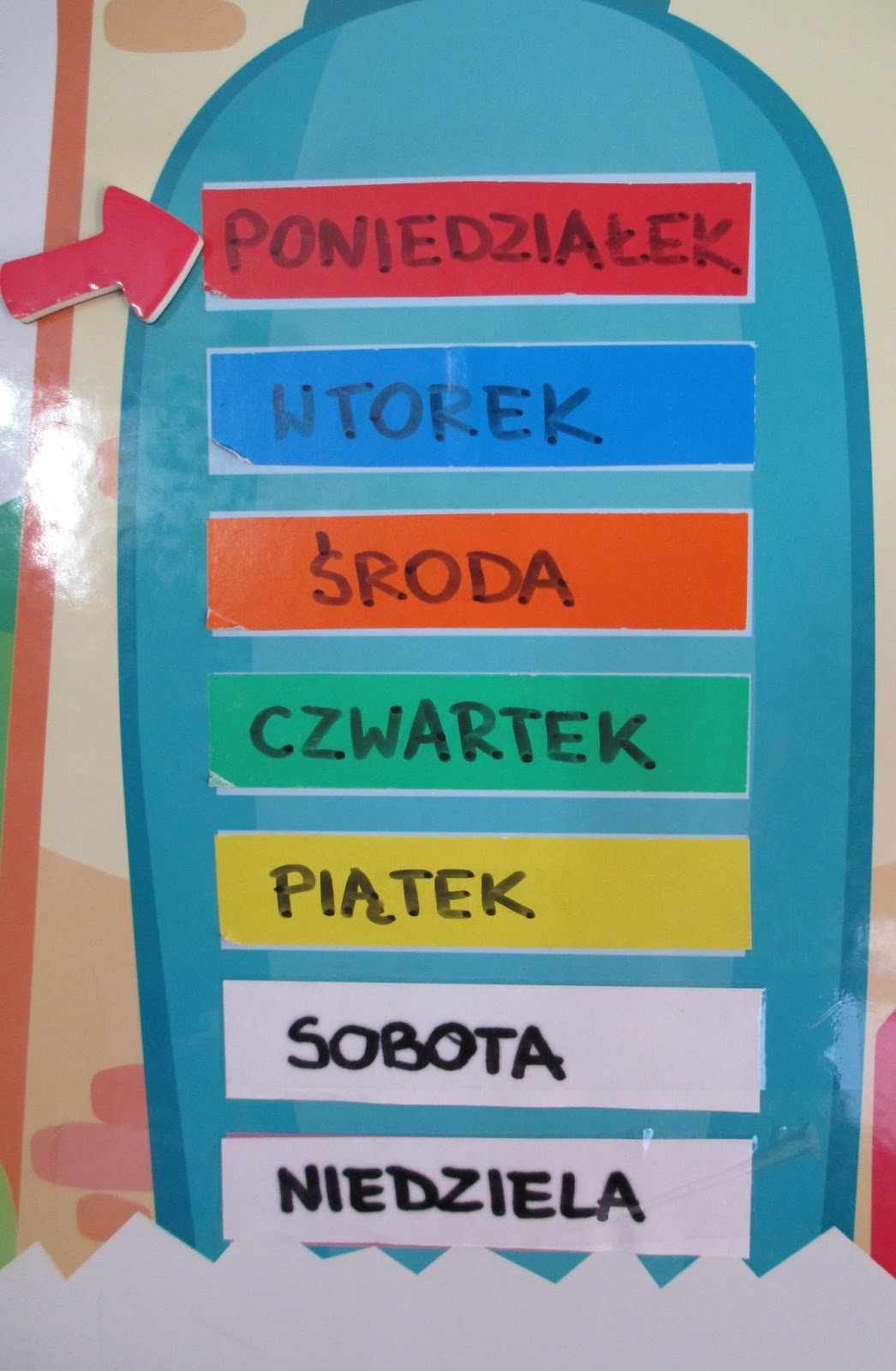 Kalendarz kupiony w Bambino, troszkę przerobiony. Zależało mi na tym, żeby dni tygodnia były w kolorach zgodnych z tymi przyjętymi w planie daltońskim. Dokleiłam napisy z papieru samoprzylepnego.